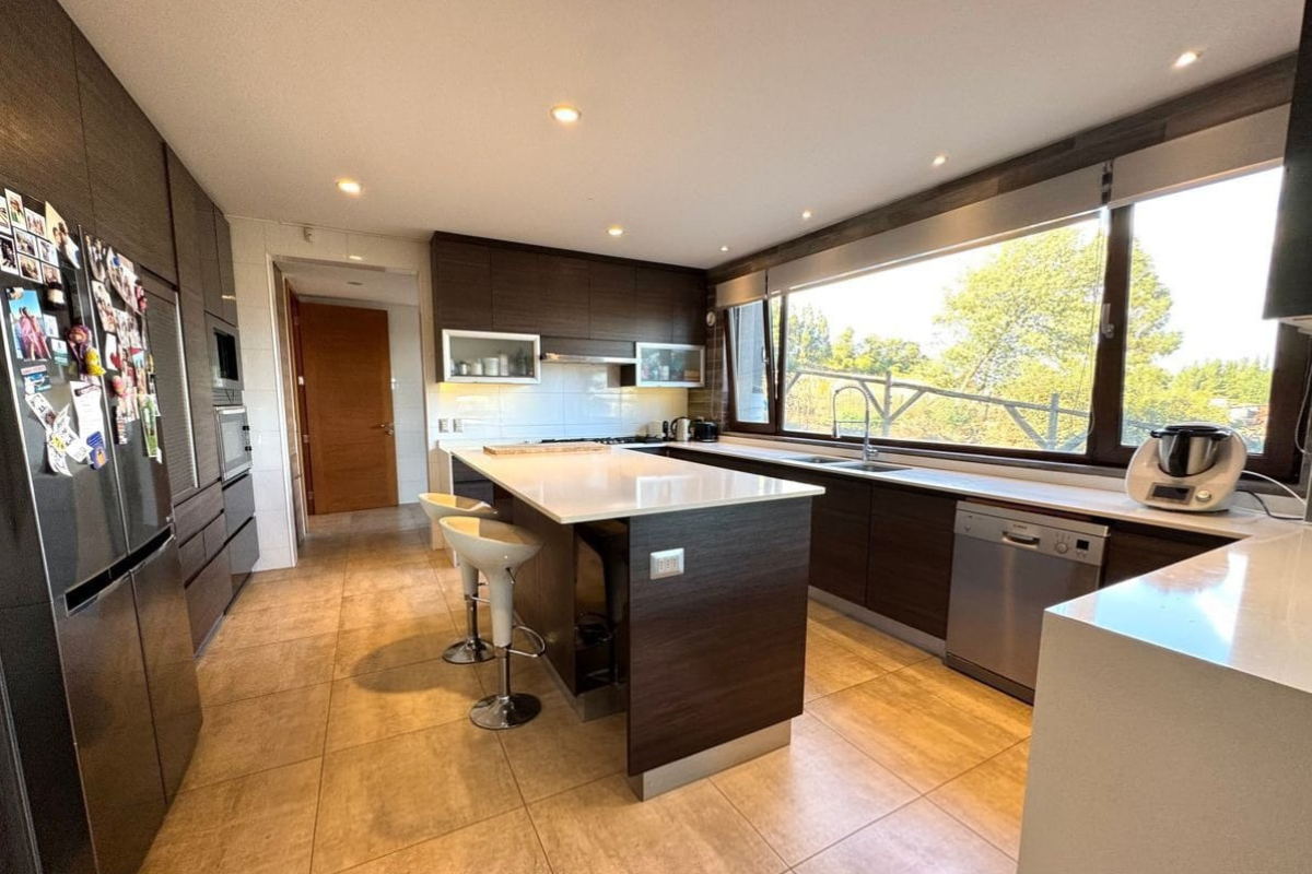 - Moderna cocina con encimera de granito, isla central y comedor de diario.